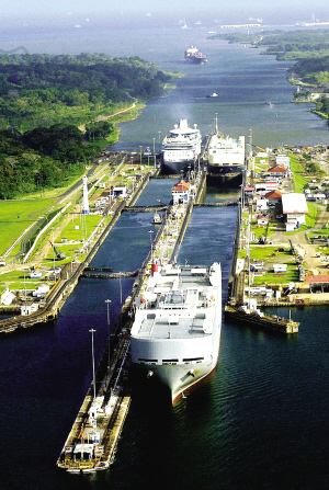 巴拿马运河是世界上最具有战略意义的两条人工水道之一,另一条为苏伊士运河。行驶于美国东西海岸之间的船只,原先不得不绕道南美洲的合恩角(Cape Horn),使用巴拿马运河后可缩短航程约15,000公里(8,000英里)。由北美洲的一侧海岸至另一侧的南美洲港口也可节省航程多达6,500公里(3,500?)。航行于欧洲与东亚或澳大利亚之间的船只经由该运河也可减少航程3,700公里(2,000?)。 巴拿马运河全长81.3千米,水深13米~15米不等,河宽150米至304米。整个运河的水位高出两大洋26米,设有6座船闸。船舶通过运河一般需要9个小时,可以通航76000吨级的轮船。