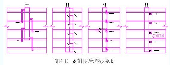 (一)厨房、浴室、厕所等的垂直排风管道,应采取防止回流措施或在支管上设置防火阀。见图18-19。