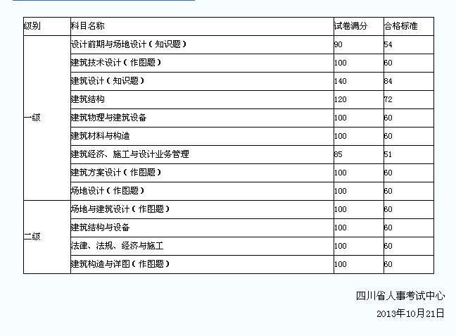 根据人力资源和社会保障部办公厅《关于2013年度注册建筑师资格考试合格标准有关问题的通知》(人社厅发〔2013〕100号),现就2013年度注册建筑师资格合格标准通知如下: