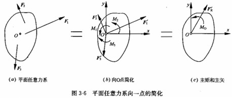 平面任意力系向作用面内任一点 O 简化,可得到一个力和一个力偶(图 3 -6 )。这个力等于该力系的主矢(即各力的矢量和),作用线通过简化中心O;这个力偶的矩等于该力系对于点 O 的主矩(即各力对点 O 的矩的代数和)。