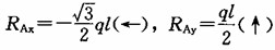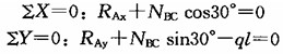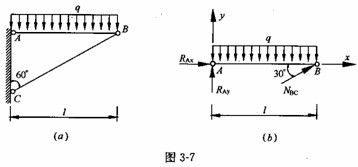 取横梁 AB 为研究对象,作出受力图如图 3 -7 ( b )所示。梁 AB 除受均布荷载 q 外,在铰支端 A 处还受约束反力 RAx 、 RAy 的作用,B处还受二力杆BC的约束反力 NBC(设为压力)的作用。梁 AB 上的这些力组成一平面任意力系。