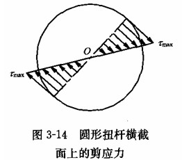 扭杆横截面上只有剪应力。圆形扭杆横截面上任一点的剪应力与该点到圆心的距离成正比,方向垂直于该点与圆心的连线。因此,整个横截面上的剪应力沿截面半径成三角形分布,如图 3 -14 所示。