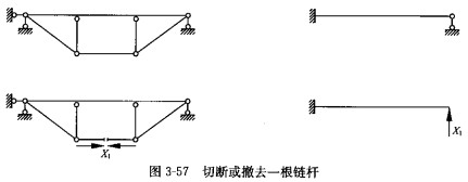 ( 1 )切断一根链杆,或撤去一根支座链杆,相对于去掉一个约束(图 3 - 57 )