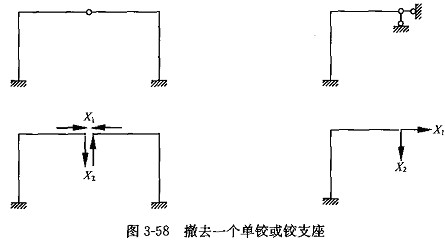 ( 2 )撤去一个单铰,或撤去一个固定铰支座,相对于去掉两个约束(图 3- 58 ) ;