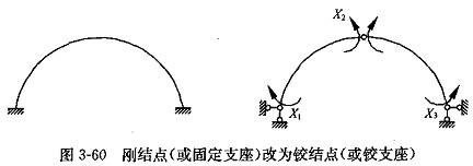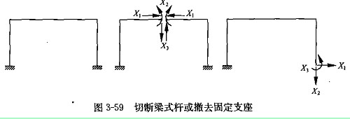 ( 3 )切断一根梁式杆或一个刚结点,或撤去一个固定支座,相对于去掉三个约束(图 3 -59 )