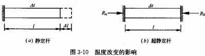 自然界中的物体普遍存在热胀冷缩的现象,杆件结构也是一样。例如图 3 -10 ( a )所示的杆件,若其温度升高Δt,因没有多余约束(即为静定),故杆件可以自由地伸缩,并不会产生内力或反力。