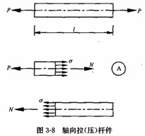 依据平面假设,轴向拉(压)杆件的变形沿整个横截面是均匀的,因而应力在横截面上也是均匀分布的(图 3-8)。