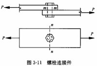 例如图 3-11所示的螺栓连接件,当钢板受拉力 P 作用时,螺栓将在截面m-m处承受剪力,并产生剪切变形。在实用计算中,通常假设螺栓受剪面上各处的剪应力都相等,即名义剪应力等于受剪面所承受的剪力除以受剪面的面积。