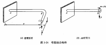 图 3 -24 ( a )所示为一端固定另一端自由的折杆,自由端 C 处作用一竖向集中荷载P。取 AB 杆进行分析(图 3 -24b ) ,此时 B 端的作用力为一竖向集中力P和一力偶m= Pb 。力偶 m 的作用面垂直于 AB 杆轴线,故为一扭矩,因此 AB 杆属于弯曲和扭转的组合变形情况。