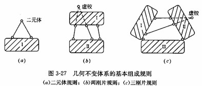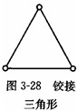 上述三个基本组成规则的核心实际上只有一个,即铰接三角形规则。在平面体系中,铰接三角形(图 3 -28 )是一个稳定的平面组成形式。将铰接三角形中的一根链杆、两根链杆及三根链杆分别替换为一个刚片(即任一几何不变部分)、两个刚片和三个刚片,同时将虚铰的作用与一个单铰同等看待,即可分别得到二元体规则、两刚片规则和三刚片规则。