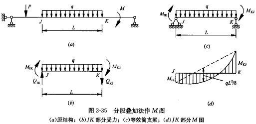 结构中的任一直杆段若受横向荷载作用(图 3 -35a、b ) ,则该杆段的弯矩图等于将该杆段视作简支梁,在简支端单独作用该杆段的端部弯矩与简支梁单独作用横向荷载的弯矩图的叠加(图 3 -35 c)。这种作弯矩图的方法称为分段叠加法作弯矩图。由于简支梁在一些常见荷载(如满跨均布荷载、跨中集中荷载等)下的弯矩图较为简单,因此利用分段叠加法往往可以简化弯矩图的绘制.