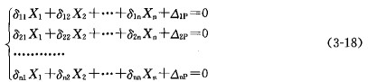 ( 3 )根据基本结构在多余力和原有荷载共同作用下,多余力作用点沿其作用方向的位移与原结构相应位移相等的条件,建立 n 个关于多余未知力的方程,即力法典型方程如下: