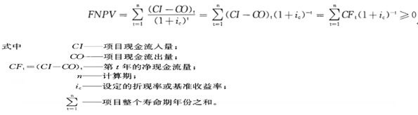 财务净现值是反映项目在整个寿命期内总的获利能力的动态评价指标。它是指项目按部门或行业的基准收益率(ic)或设定的折现率(当未制定基准收益率时),将各年的净现金流量,折现到建设开始年(基准年)的现值总和,即为工程项目逐年净现金流量的现值代数和。其计算公式为: