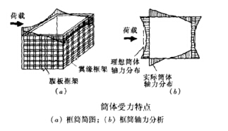 1.筒体是空间整截面工作的,如同一竖在地面上的悬臂箱形梁。框筒在水平力作用下不仅平行于水平力作用方向上的框架(称为腹板框架)起作用,而且垂直于水平方向上的框架(称为翼缘框架)也共同受力。薄壁筒在水平力作用下更接近于薄壁杆件,产生整体弯曲和扭转。