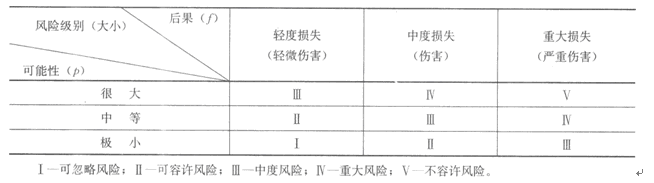 GB/T 28002推荐的简单的风险等级评估如表lZ205022-1所示,结果分为Ⅰ、Ⅱ、Ⅲ、Ⅳ、Ⅴ五个风险等级。