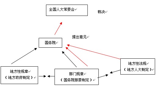 2、地方性法规(地方人大制定)与部门规章(国务院部委制定)之间对同一事项的规定不一致,由国务院提出意见,国务院认为应当适用地方性法规的,应当适用地方性法规;国务院认为应当适用部门规章的,应当提请全国人民代表大会常务委员会裁决