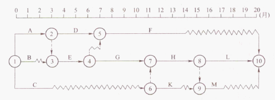 (4)此时,线路G―H―L工期缩减至10个月;工作F线路自由时差为6个月,压缩4个月后仍不会成为关键线路;线路G―H―M工期相应缩减至3+(2+2)=7,也不会成为关键线路,故此时的关键线路仍为G―H―L,整个工程总工期为6+10=16个月,正好弥补施工初期4个月的工期滞后,可满足业主提出的按原计划日期竣工的要求。