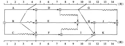 86.下图所示的工程双代号时标网络计划,执行到第4周末及第10周末时,检查其实际进度如图中前锋线所示,检查结果表明( )。