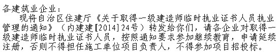 摘要 巴彦淖尔一级建造师临时执业证书人员执业管理通知,要求各企业对取得一级建造师临时执业证书的人员通知进行继续教育,申请延续注册。