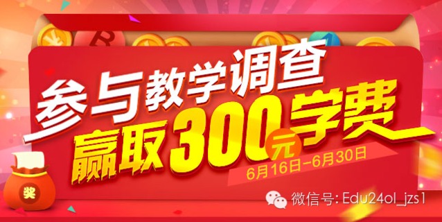 参与方式:在活动页面注册新用户名,注册成功后,回答有关教学的调查问卷,即可获取300元学费,学费会在提交问卷后自动存到您的用户中心。