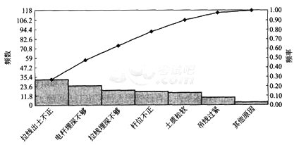对某架空线路工程质量问题的调查,发现导致杆歪的原因有:电杆埋深不够24处,拉线出土不正32处,拉线埋深不够18处,土质松软15处,吊线过紧9处,杆位不正17处,其他原因3处。