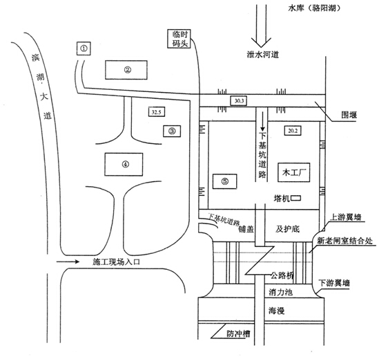 根据施工需要,现场布置有混凝土拌合系统、钢筋加工厂、木工厂、临时码头、配电房等临时设施。其平面布置示意图如下,图中①、②、③、④、⑤为临时设施(混凝土拌合系统、油库、机修车间、钢筋加工厂、办公生活区)代号。