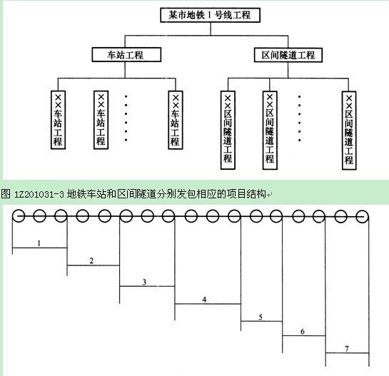 由于如图1Z201031-3所示的项目结构在施工时交界面较多,对工程的组织与管理可能不利,因此国际上较多的地铁工程则采用图1Z201031-4的方式,如图1Z201031-5所示进行项目结构分解。