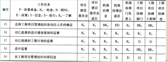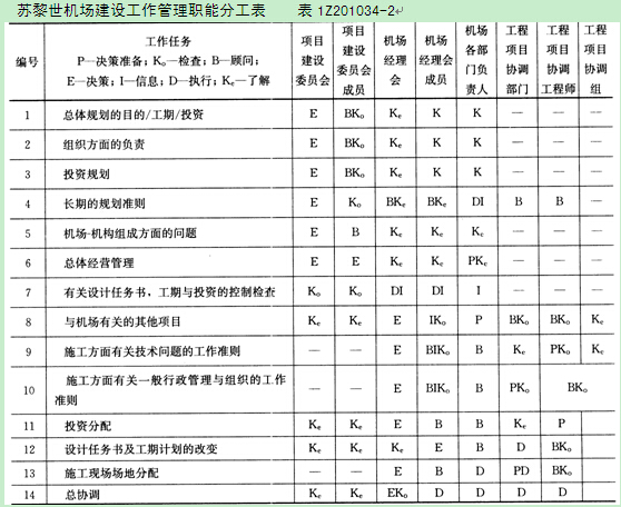 表1Z201034-2是苏黎世机场建设工作的管理职能分工表,它将管理职能分成7个,即决策准备、决策、执行、检查、信息、顾问和了解。决策准备与筹划的含义基本相同。从表1Z201034-2可以看出,每项任务都有工作部门或个人负责决策准备、决策、执行和检查。我国多数企业和建设项目的指挥或管理机构,习惯用岗位责任制的岗位责任描述书来描述每一个工作部门的工作任务(包括责任、权利和任务等)。工业发达国家在建设项目管理中广泛应用管理职能分工表,以使管理职能的分工更清晰、更严谨,并会暴露仅用岗位责任描述书时所掩盖的矛盾。如使用管理职能分工表还不足以明确每个工作部门的管理职能,则可辅以使用管理职能分工描述书。