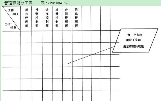 管理职能分工表是用表的形式反映项目管理班子内部项目经理、各工作部门和各工作岗位对各项工作任务的项目管理职能分工(见表1Z201034-1)。表中用拉丁字母表示管理职能。管理职能分工表也可用于企业管理。