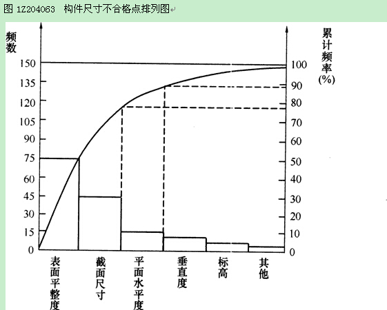 表1Z204063-1表示对某项模板施工精度进行抽样检查,得到150个不合格点数的统计数据。然后按照质量特性不合格点数(频数)由大到小的顺序,重新整理为表