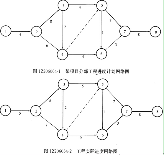 将延误后的持续时间代人原网络计划,即得到工程实际网络图,如图1Z206064-2所示。比较图1Z206064-1和图1Z206064-2,可以发现实际总工期变为3 5周,延误了3周,承包商责任造成的延误(1周)不在关键线路上,因此,承包商可以向业主要求延长工期3周。