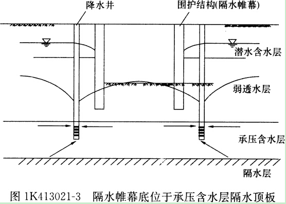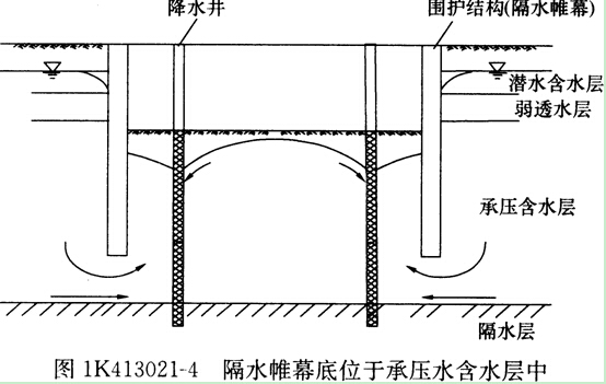 隔水帷幕位于承压水含水层顶板中,通过井点降水降低基坑下部承压含水层的水头,以防止基坑底板隆起或承压水突涌为目的,见图1 K413021-3 。这类隔水帷幕未将基坑内、外承压含水层分隔开。由于不受围护结构的影响,基坑内、外地下水连通,这类井点降水影响范围较大。此时,应把降水井布置于基坑外侧。因为即使布置在坑内,降水依然会对基坑外围有明显影响,如果布置在基坑内反而会多出封井问题。