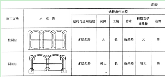 (2)上述不同掘进(开挖)方式与选择考虑主要条件如表1K413041所示,以供工程实践中参考。