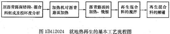 综上所述,无论哪种就地热再生工艺方法,都必须事先对破损的路面进行取样检测分析;再选择相应的施工工艺方法,制定具体的施工方案,并确定应添加材料的性质和比例。不论是复拌再生、重铺再生还是整形再生,其就地热再生的基本工艺流程如图 1B412O24 所示。
