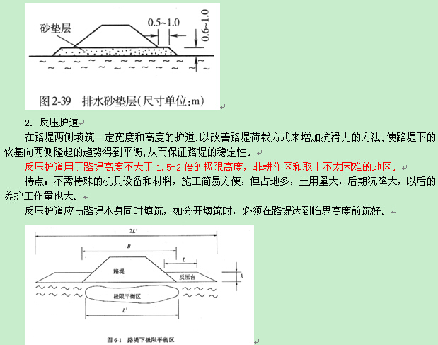 砂垫层用于路堤高度小于2倍极限高度(在天然软土地基上,基底不作特殊加固处理而用快速施工方法修筑路堤的填筑最大高度)软土层及其硬壳较薄,或软土表面渗透性很低的硬壳等情况。亦可用于软土层稍厚但具有双面排水条件的地基。有排水砂垫层、换土砂垫层、砂垫层和土工布混合使用等形式。