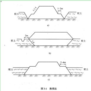 将软弱地基层全部挖除或部分挖除,用透水性较好的材料(如砂砾、碎石、钢渣等)进行回填。该方法简单易行,也便于掌握。对于软基较浅((1-2m)的泥沼地特别有效。