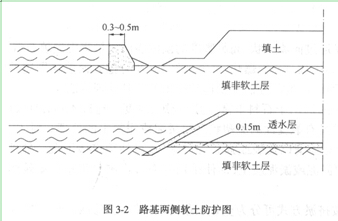 路堤与两侧沼泽不能完全隔离,在清除路基底部软土后,如渗透性良好的土源缺乏,可在路堤底面用砂石料设置透水性路堤。