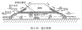 片石露出水面后,宜用重型压路机反复碾压,然后在其上面铺反滤层,再行填土。