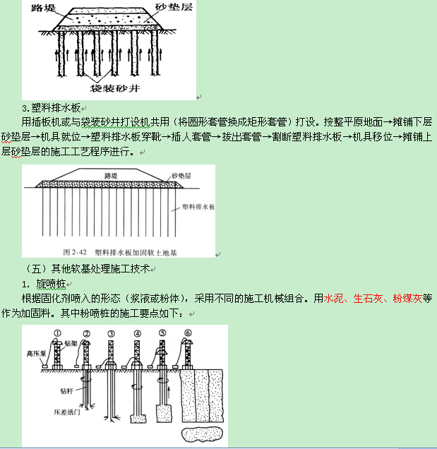 利用砂井、袋装砂井、塑料排水板增加土层竖向排水途径,缩短排水距离、加速地基固结。