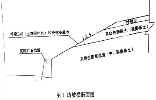 某高速公路膨胀土路堑段,长480m,挖深8~9m,右侧为顺层边坡,岩土层倾角为12~15o,结构面内摩擦角为5o,粘聚力为12Kpa。边坡加固防护方案如图1所示。