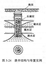 当路基附近的地面水或浅层地下水无法排除,影响路基稳定时,可设置渗井,将地面水或地下水经渗井通过下透水层中的钻孔流人下层透水层中排除。