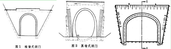 (1)拱式明洞。拱式明洞主要由顶拱和内外边墙组成混凝土或钢筋混凝土结构,整体性较好,能承受较大的垂直压力和侧压力。内外墙基础相对位移对内力影响较大,所以对地基要求较高,尤其外墙基础必须稳固。必要时还可加设仰拱。