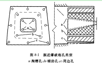 根据坑道断面、岩石性质和地质构造等条件,掏槽眼排列形式有很多种,总的可分成斜眼掏槽和直眼掏槽两大类。