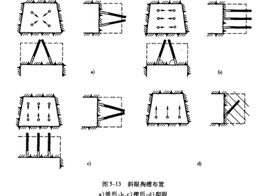 (1)斜眼掏槽:其特点是掏槽眼与开挖面斜交。常用的有锥形掏槽,楔形掏槽,单向掏糟,其中最常用的是竖楔形掏槽。斜眼掏槽的优点是可以按岩层的实际情况选择掏槽方式和掏槽角度,容易把岩石抛出,而且所需掏槽眼的个数较少。缺点是眼深受坑道断面尺寸的限制,也不便于多台钻机同时凿岩。