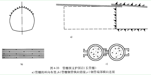 长管棚(长度为10―45m,直径较粗的钢管)一次超前量大,单次钻孔或打人长钢管的作业时间较长,但减少了安装钢管的次数,减少了与开挖作业之间的干扰。