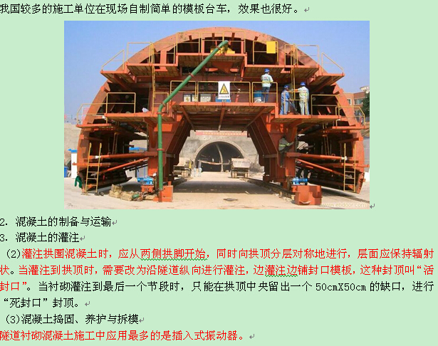 衬砌施工顺序,目前多采用由下到上、先墙后拱的顺序连续浇筑。在隧道纵向,则需分段进行,分段长度一般为8~12m。在全断面开挖成形或大断面开挖成形的隧道衬砌施工中,则应尽量使用金属模板台车灌注混凝土整体衬砌。