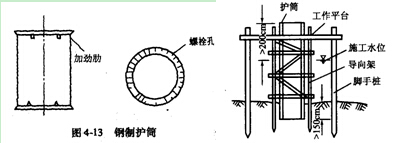 护简要求坚固耐用,不漏水,其内径应比钻孔直径大(旋转钻约大20cm,潜水钻、冲击或冲抓锥约大40cm),每节长度约2~3m。一般常用钢护筒,在陆上与深水中均能使用,钻孔完成,可取出重复使用。在深水中埋设护筒时,先打人导向架,再用锤击或振动加压沉人护筒。护筒人土深度视土质与流速而定。