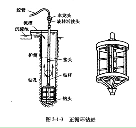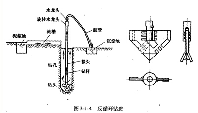 ②反循环回转法:与正循环法不同的是泥浆输入钻孔内,然后从钻头的钻杆下口吸进,通过钻杆中心排出至沉淀池内。其钻进与排渣效率较高,但接长钻杆时装卸麻烦,钻渣容易堵塞管路。另外,因泥浆是从上向下流动,孔壁坍塌的可能性较正循环法的大,为此需用较高质量的泥浆。