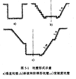 (2)黏土在半干硬或硬塑状态,基坑顶缘无活荷载,稍松土质基坑深度不超过0.5m,中等密实(锹挖)土质基坑深度不超过1.25m,密实(镐挖)土质基坑深度不超过2.Om时,均可采用垂直坑壁基坑。基坑深度在5m以内,土的湿度正常时,采用斜坡坑壁开挖或按坡度比值挖成阶梯形坑壁,每梯高度为0.5~1.Om为宜,可作为人工运土出坑的台阶。基坑深度大于5m时,坑壁坡度适当放缓,或加做平台。土的湿度影响坑壁的稳定性时,应采用该湿度下土的天然坡度或采取加固坑壁的措施。当基坑的上层土质适合敞口斜坡坑壁条件,下层土质为密实黏土或岩石时,可用垂直坑壁开挖,在坑壁坡度变换处,应保留有至少0.5m的平台。