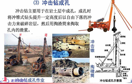 ③冲击钻孔:冲击钻成孔灌注桩适用于黄土、粘性土或粉质粘土和人工杂填土层,特别适合于在有孤石的砂砾石层、漂石层、硬土层、岩层中使用。